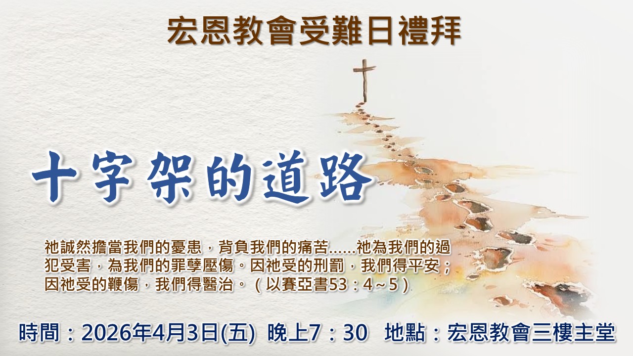 2026受難日聖餐禮拜「十字架的道路」 時間:4/3 (五) 晚上7:30地點:宏恩教會三樓主堂 ❤️邀請大家一起體會耶穌走向十字架的愛和救贖,讓每一段經文、每一首詩歌、每一個禱告,安慰我們,激勵我們與主同行,活出愛的生命!